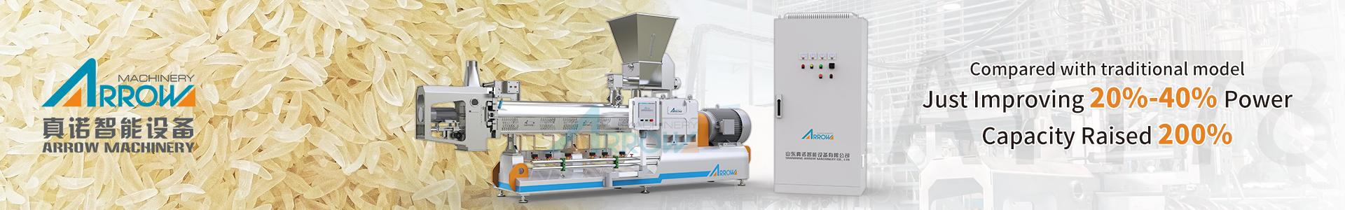 Esta línea de producción de granos de arroz fortificados artificialmente/nutricionalmente se ha estudiado considerando la pérdida de nutrientes en el arroz producido mediante el procesamiento tradicional. Se le añaden nutrientes adicionales antes de la cocción por extrusión. Además, mediante este proceso, el salvado de arroz partido se puede reutilizar. El proceso para producir granos de arroz artificial consiste en mezclar harina de arroz, agua y aceite, cocinarlos en una extrusora, darles forma de grano de arroz, secarlos y enfriarlos a baja temperatura. Esta técnica permite evitar la pérdida de nutrientes.